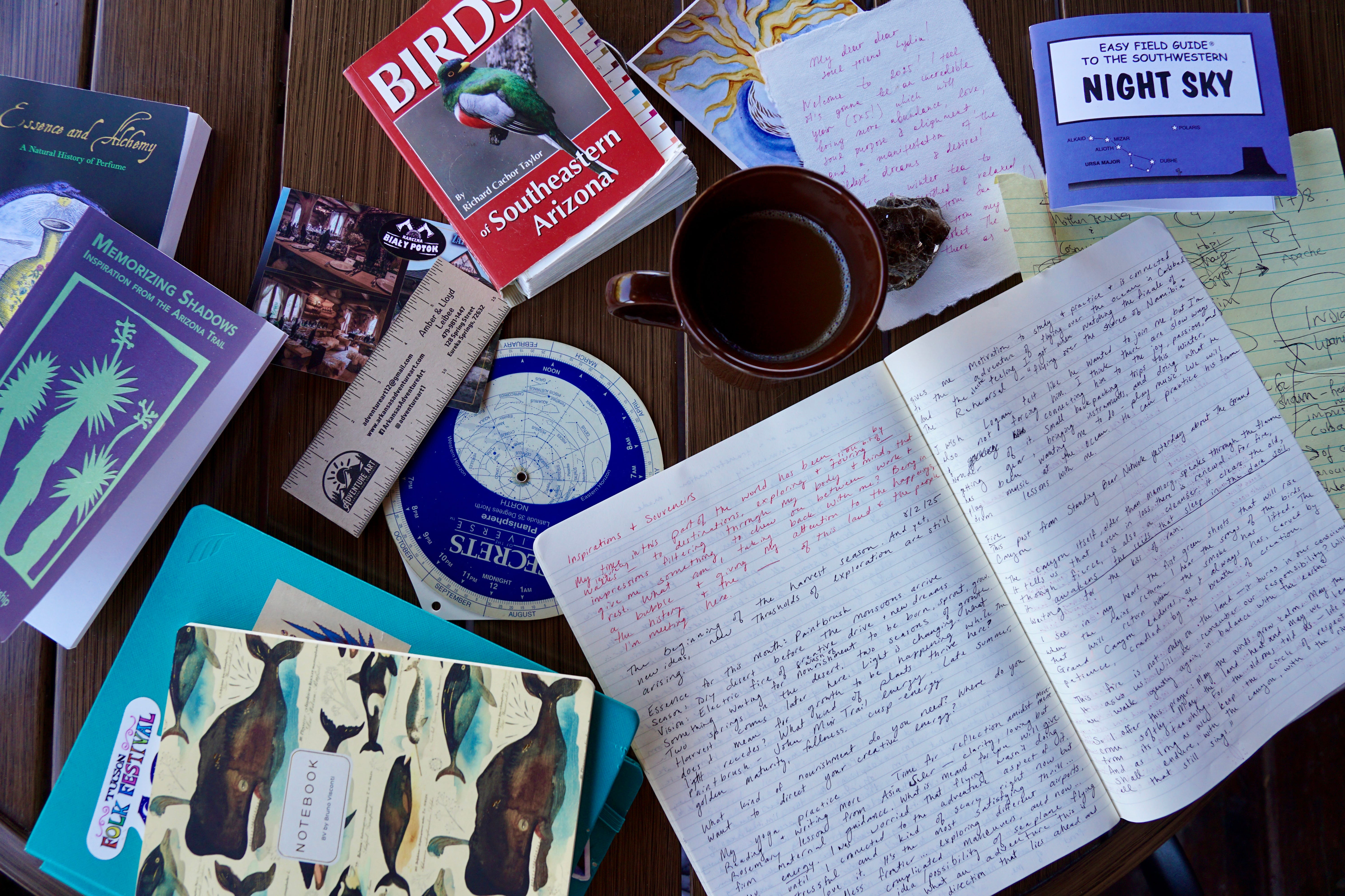 The air is cold now when the Sun rises. To step outside in bare feet is like testing the waters of an unfamiliar river. I retrest into the cabin of stone and cedar. Its warmth and coziness are alluring. I'm tempting to just stay inside and sleep a bit more because I stayed up late last night looking at the stars. But it's too late. I leave the door wide open while I make the coffee piping hot, beckoning inside, the atmosphere's crisp and snap, allowing the intoxicating chill of the pale blue sky in its summery crescendo to swirl and seep and lift the languor and teetering delirium of this long, hot siesta. I pull on wool socks and my red toboggan (even though I know I'll discard them in an hour.) I take a seat on the porch at the round table where I've gathered books and notes, postcards and a camera full of photos. My thoughts find a cadence like the grasshopper's thin song — clear and direct. Like my eyes pointed now toward the red canyon in the west, my instincts follow the funnel of light — hitched, like everything else to the swift turning of our planet. A season's effort, like the sap of juniper rising from the ground, flowing in rivulets through outstretched branches coalescing and condensing into the sharp, clean aroma of a single stunning bead.